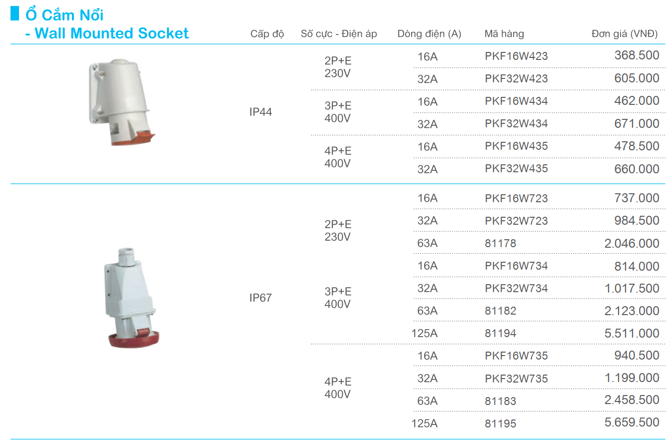 | Loại phích cắm | Ổ cắm công nghiệp gắn nổi chống nước ip67 (dạng ngồi) |