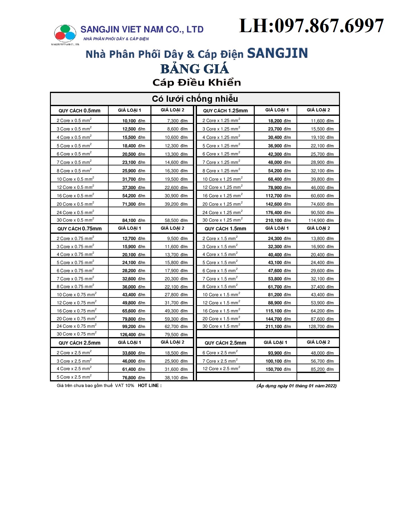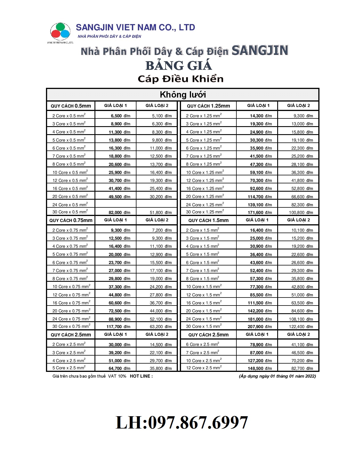 Bảng giá cáp điều khiển Sangjin MỚI NHẤT