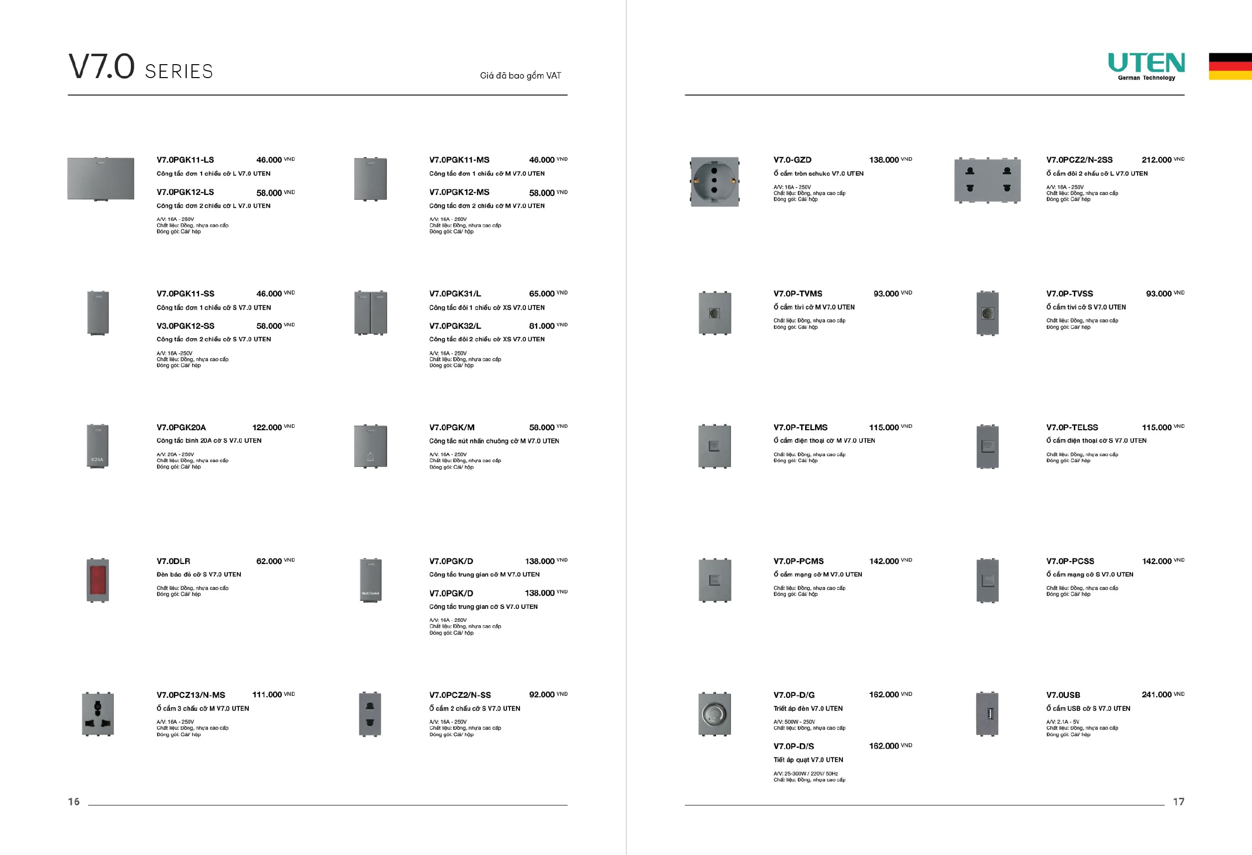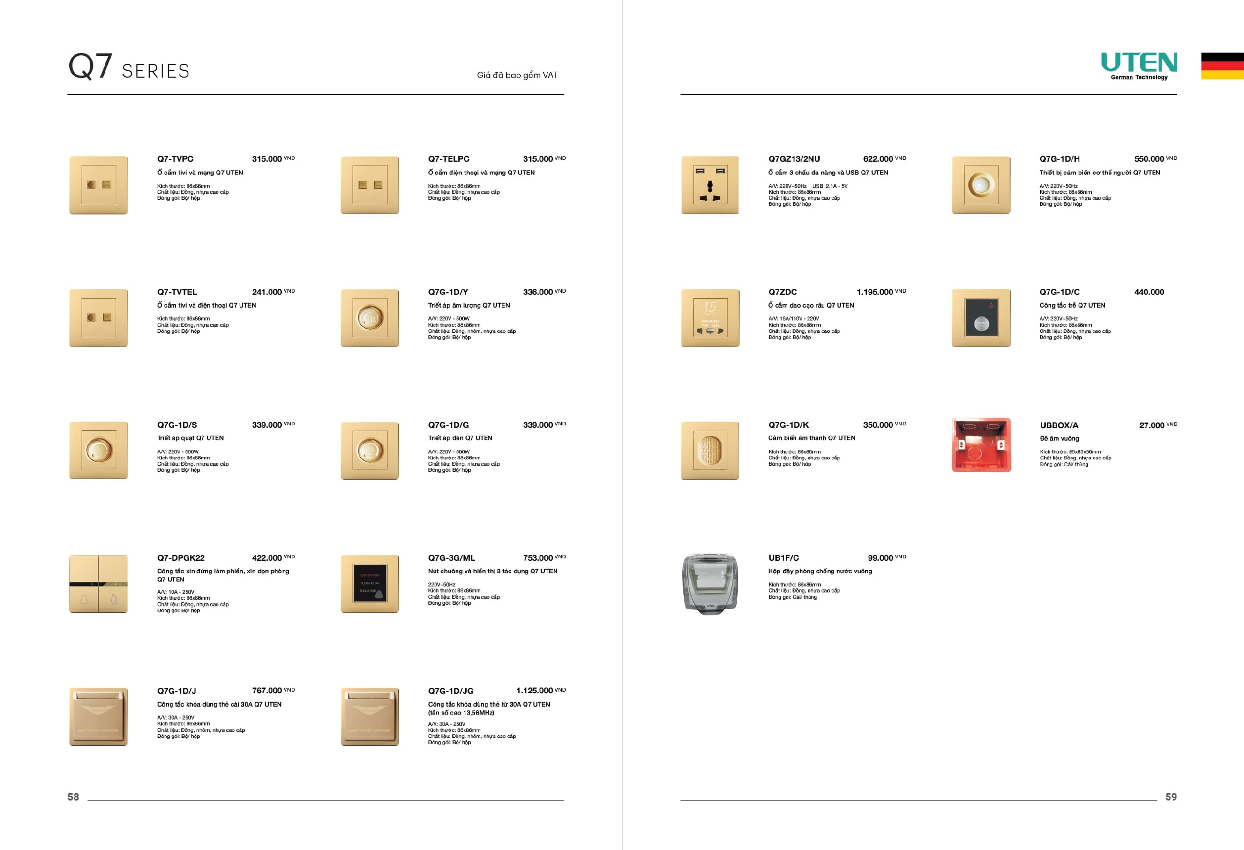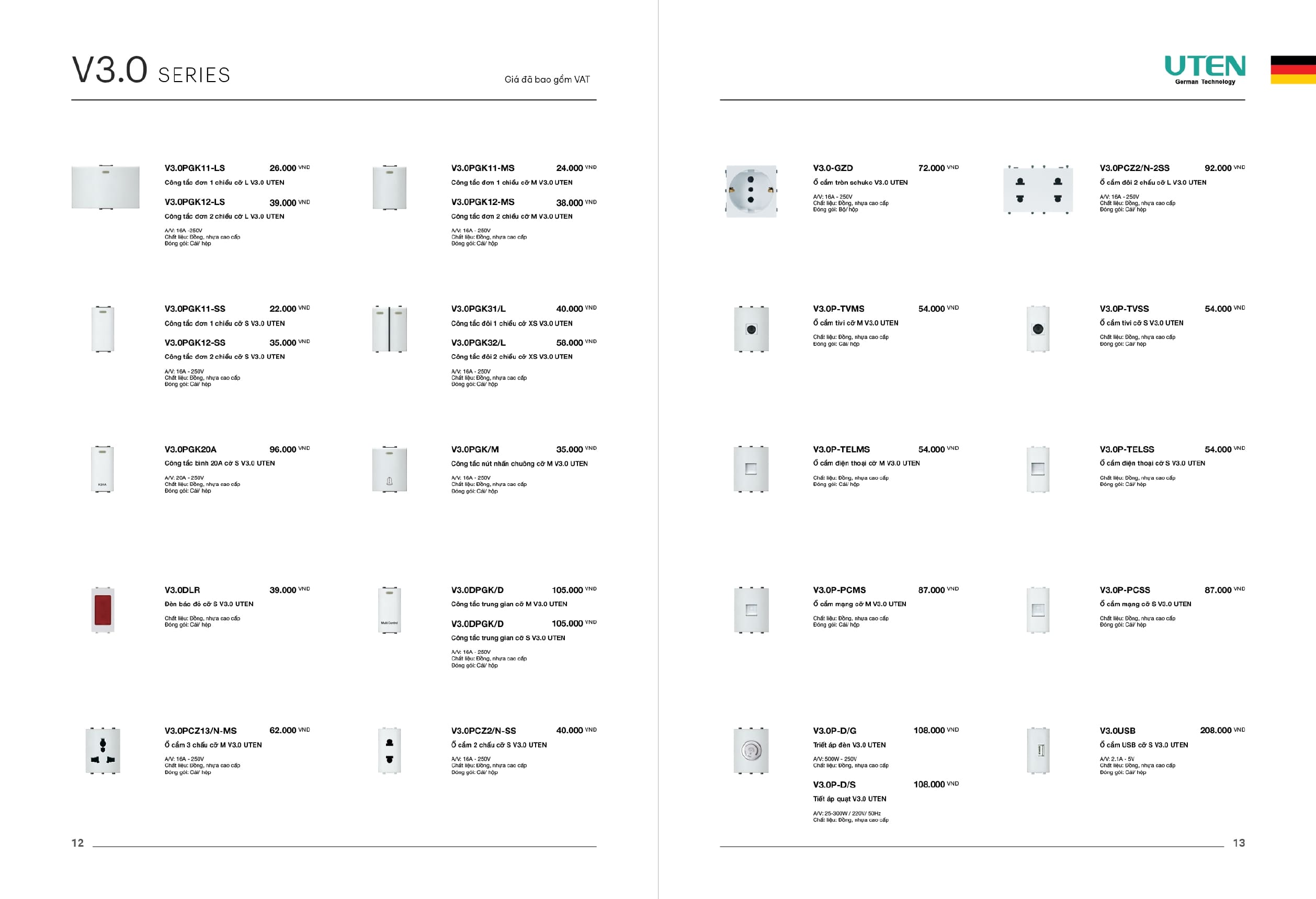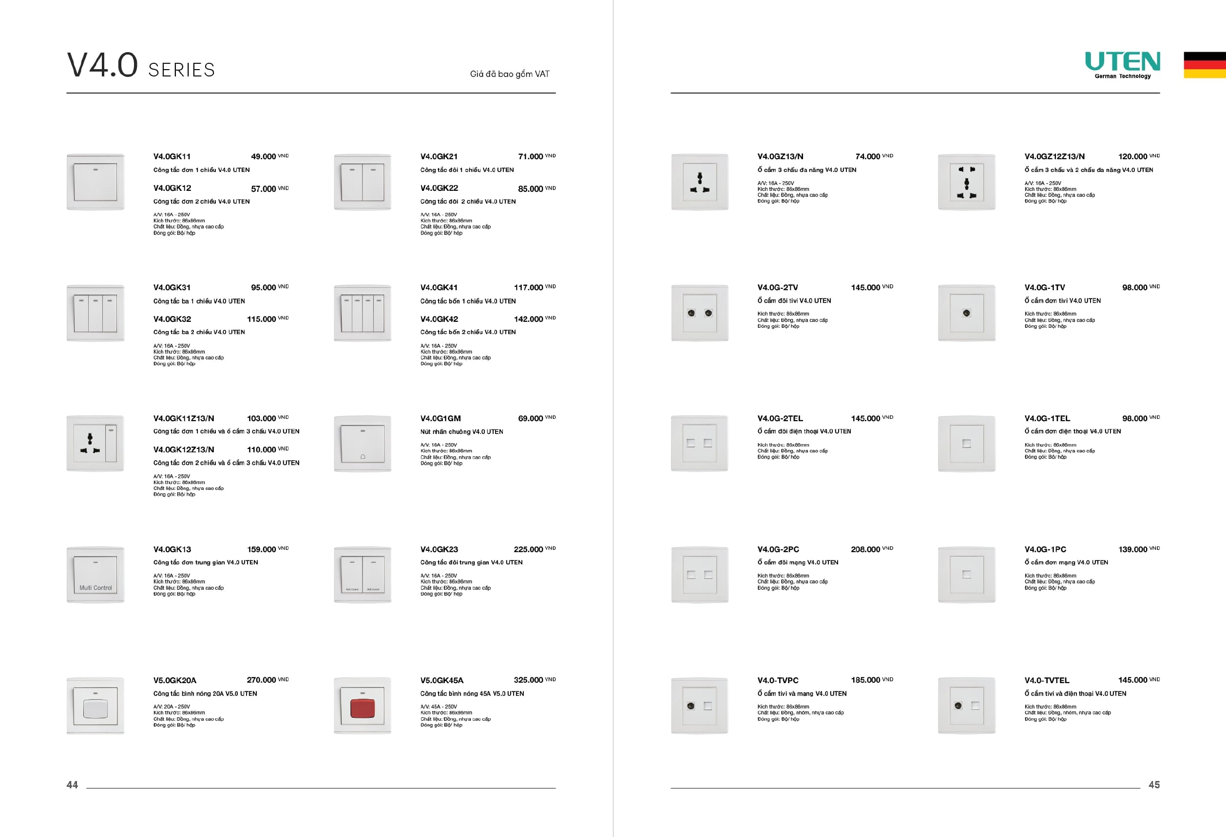 Bảng giá công tắc ổ cắm-Thiết bị điện Uten gồm dòng V6 uten, dòng V4 Uten, Q7 uten, công tắc uten, công tắc điện Uten của Đức, Ổ cắm điện Uten, âm sàn Uten