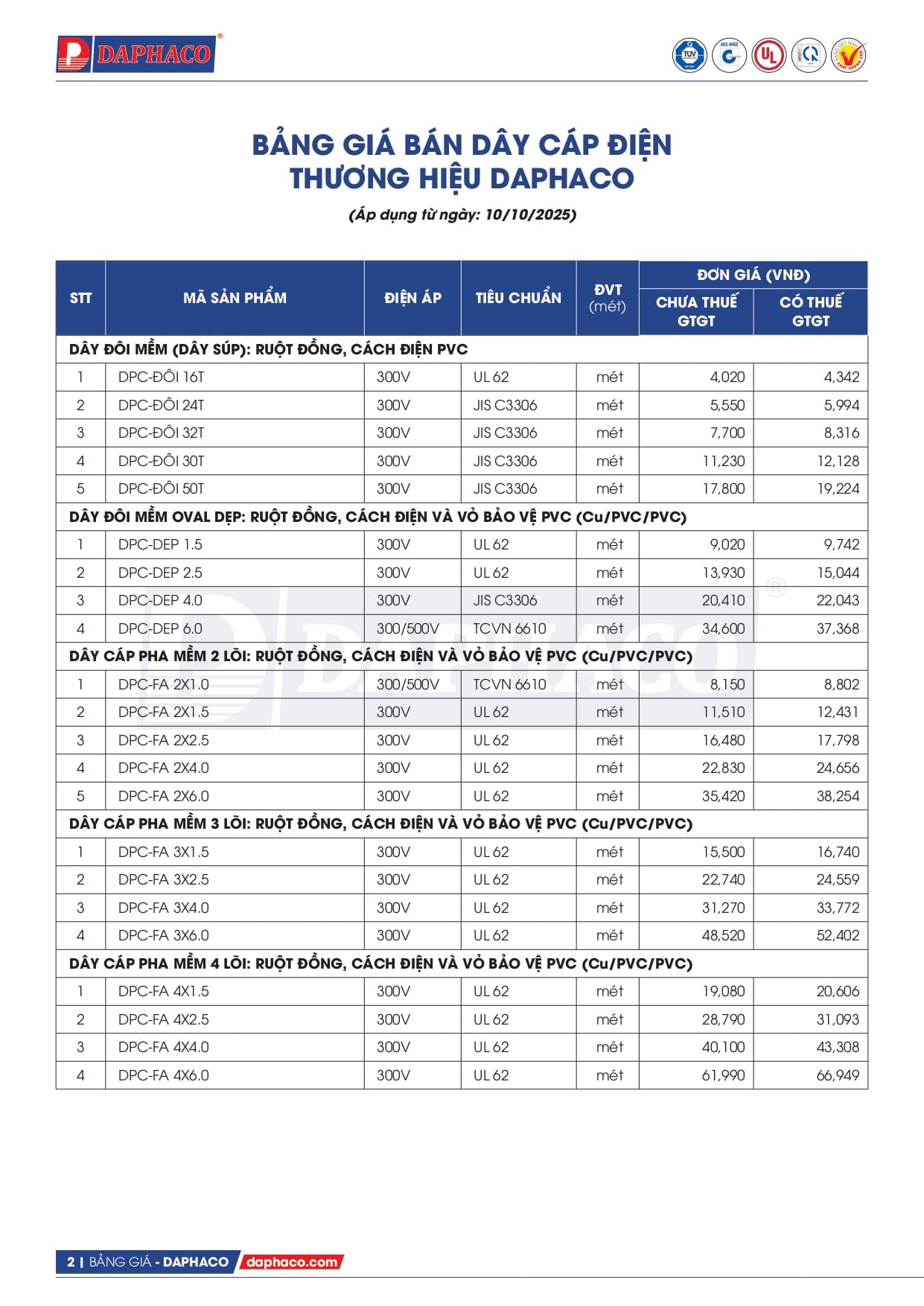 dây daphaco 2026, dây cáp điện, dây điện đôi, dây cáp pha mềm, dây cáp hàn, dây cáp điện lực
