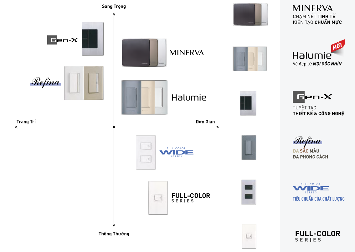 Nhằm đáp ứng cho nhiều nhu cầu sử dụng khác nhau từ công năng sử dụng cho đến decor trang trí nội thất, Panasonic hiện đang cung cấp cho người dùng 7 dòng công tắc ổ cắm khác nhau nhằm da dạng kích thước, kiểu dáng cũng như màu sắc, từ bình dân cơ bản cho đến series cao cấp.