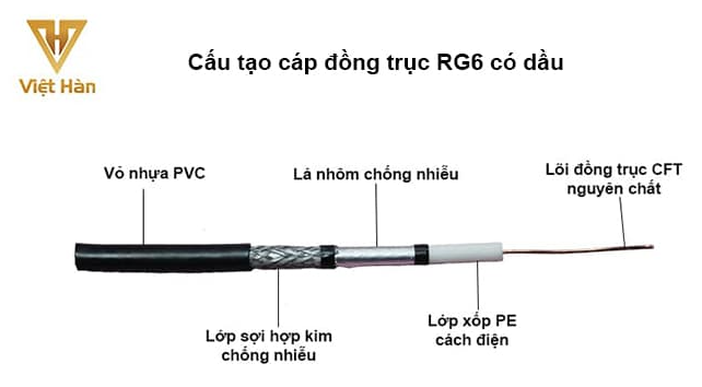 Cáp đồng trục camera chống ẩm Việt Hàn được cấu tạo thêm 1 lớp dầu Jelly tạo độ bền cao, chống ăn mòn trong môi trường ẩm ướt.