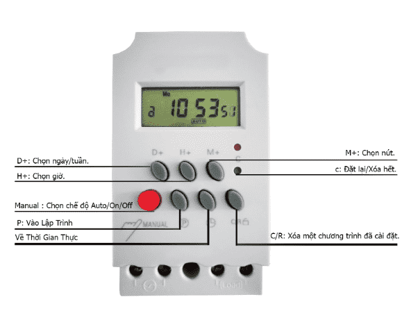 - Bấm nút P: Bấm liên tục thì màn hình hiện ra 1 ON, 1 Off, 2 ON, 2 Off…18 On, 18 Off (chú ý cài chương trình đầu tiền thì chỉ bấm 1 lần là màn hình hiện lên 1 On và bắt đầu chuyển qua bấm D+, H+, M+ để chọn tiếp ngày, giờ, phút cần mở thiết bị, sau khi xong 1 On thì bấm tiếp P để chuyển qua chương trình tiếp theo là 1 Off….