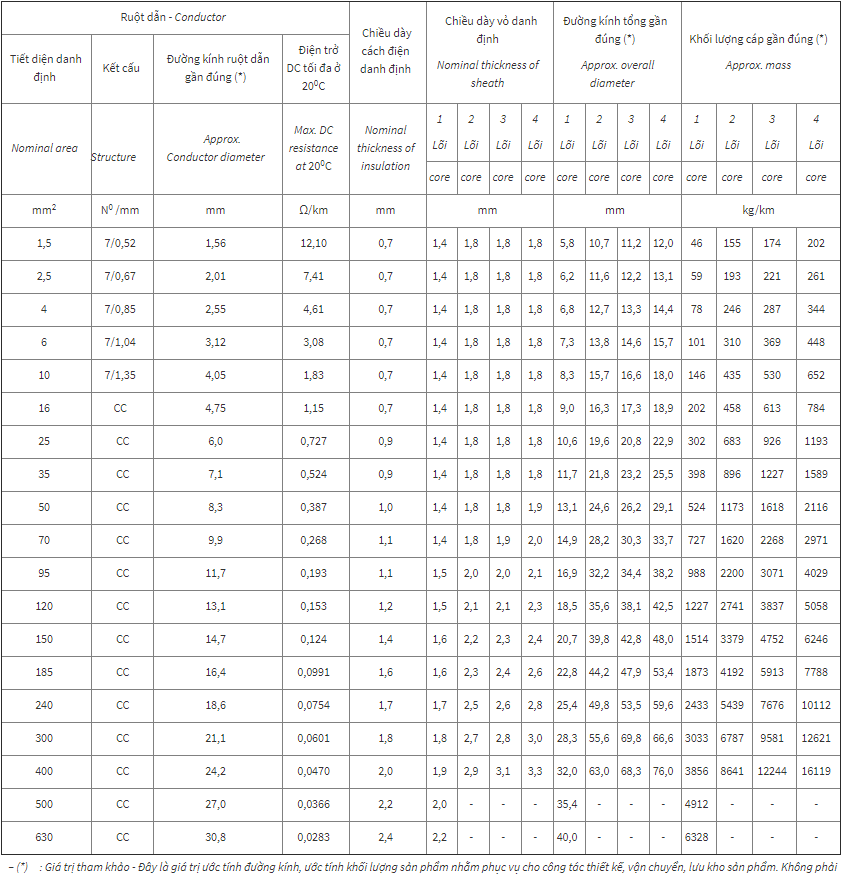 Tiết diện danh định | Lõi pha – Phase conductor | Lõi trung tính – Neutral conductor | Chiều dày vỏ danh định | Đường kính tổng gần đúng (*) | Khối lượng Cáp Gần Đúng (*) | ||||||||