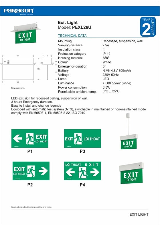 Đèn exit âm trần Paragon PEXL26U, tích hợp ATS(Bộ chuyển đổi nguồn tự động) một trong những sản phẩm nổi bật của Paragon chuyên dùng cho các tòa nhà, khách sạn, resot,...Là sản phẩm thiết yếu và cần thiết cho công trình.