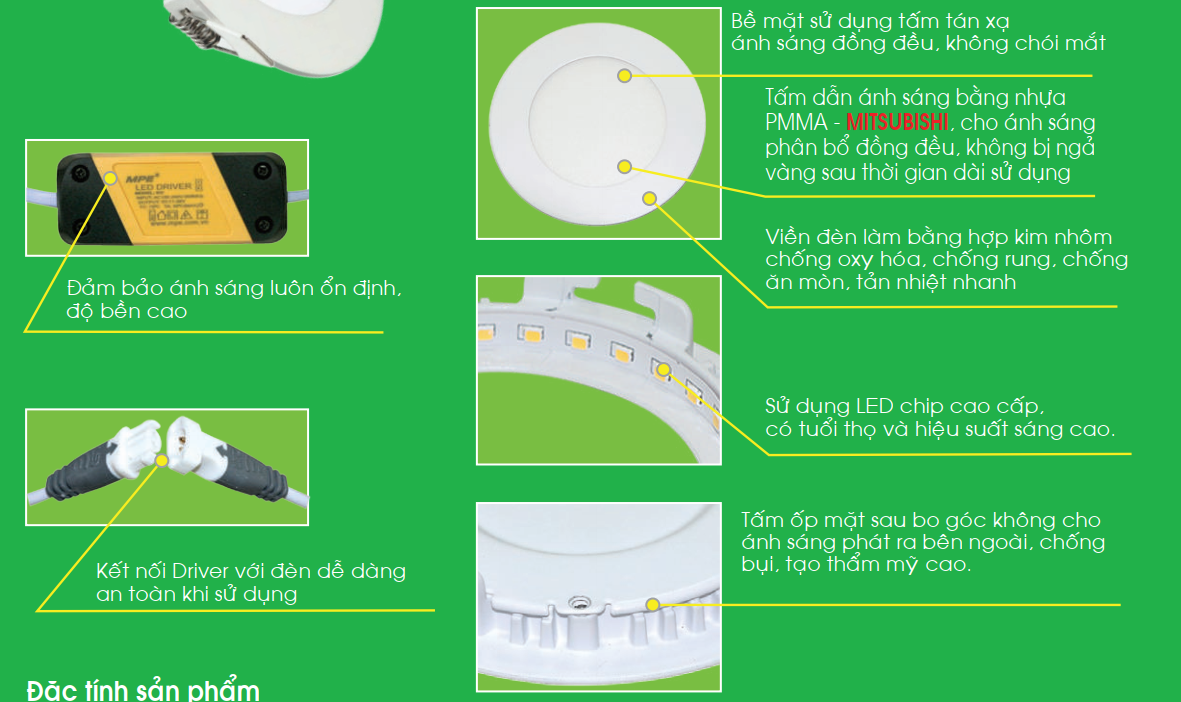 Tấm dẫn sáng bằng nhựa PMMA cũng là lợi thế giúp đèn âm trần MPE đem lại khả năng chiếu sáng đồng đều, không bị ngả vàng trong thời gian dài, dủy trì tính thẩm mỹ trong quá trình sử dụng.