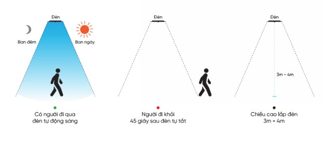 Kích hoạt cảm biến chuyển động: Đèn tự động bật khi có người đi qua và tắt sau 45 giây khi không còn ai.