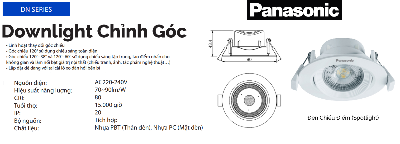 Đèn LED âm trần chỉnh góc Panasonic 5W NNNC7624588 NNNC7629588 NNNC7628588 Thuộc dòng DN Series với thiết kế dày dặn chắc chắn, lắp đặt dễ dàng với tai cài có lò xo bền bỉ