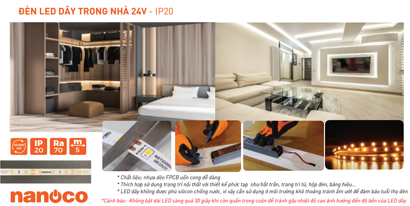 Đèn LED dây 24V Nanoco - IP20 có tính ứng dụng cao, đặc biệt khi kết hợp cùng thanh nhôm LED profile hay Silicon LED định hình, mang lại khả năng chiếu sáng liền mạch, tuyến tính, tạo hình dể dàng theo hình khối công trình.