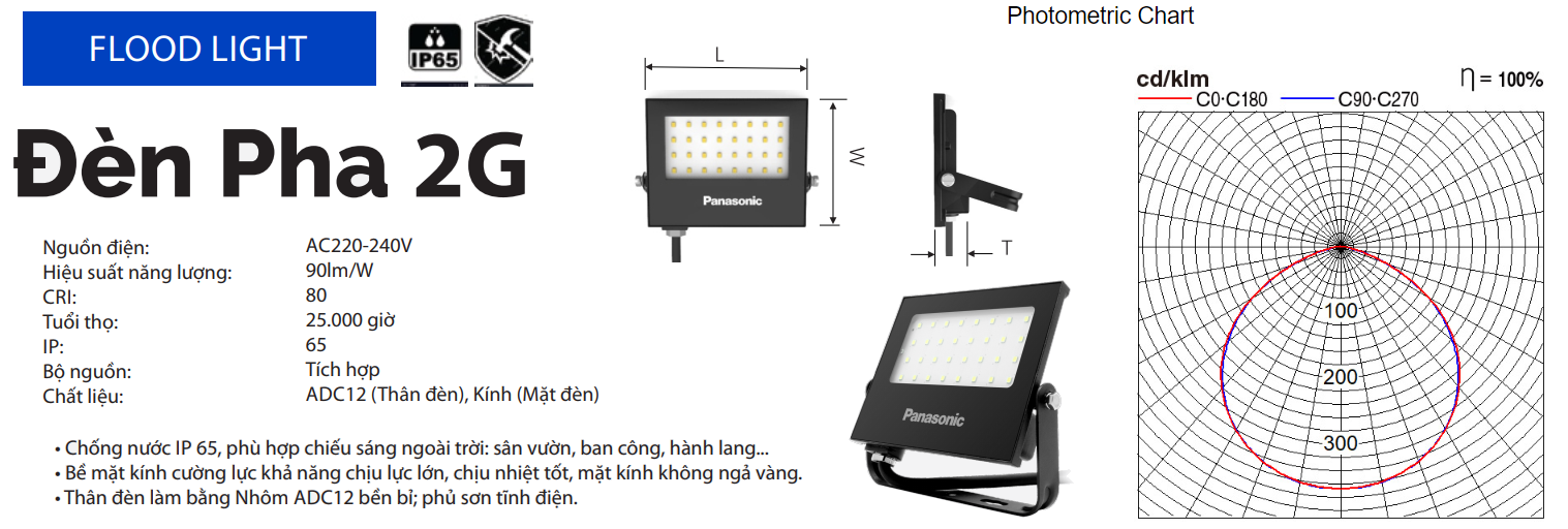 Đèn Pha LED Panasonic 20W NYV00002BE1A NYV00012BE1A NYV00052BE1A Với tiêu chuẩn chống nước IP 65, Phù hợp chiếu sáng ngoài trời như sân vườn, ban công, hành lan, sân bóng đá,...