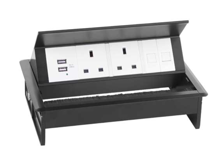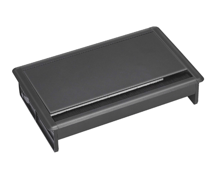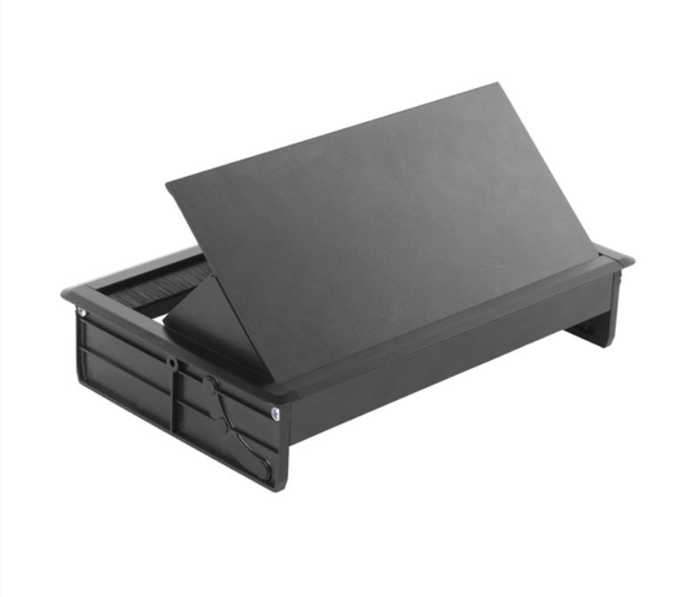 Thiết kế dạng mở nắp cùng rãnh hở luồn dây bên cạnh, Hộp ổ cắm điện lắp âm bàn Sinoamigo STS-250B có thể đóng nắp ngay khi vẫn còn cắm dây thiết bị bên trong, tăng độ an toàn khi sử dụng