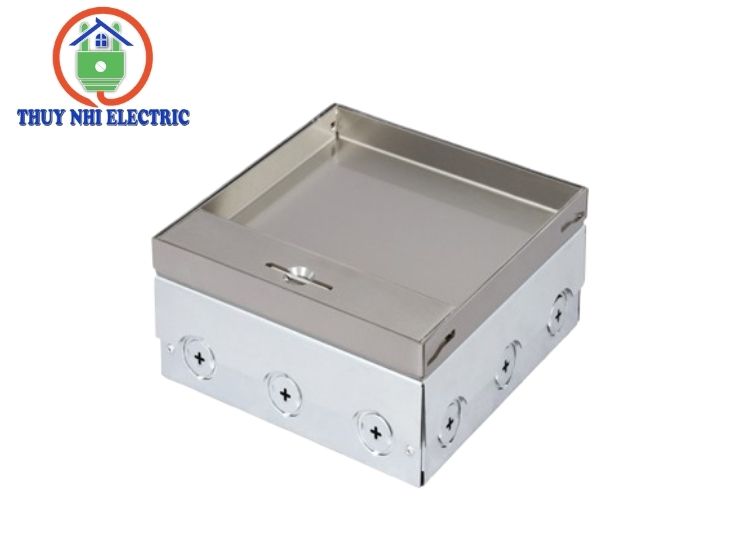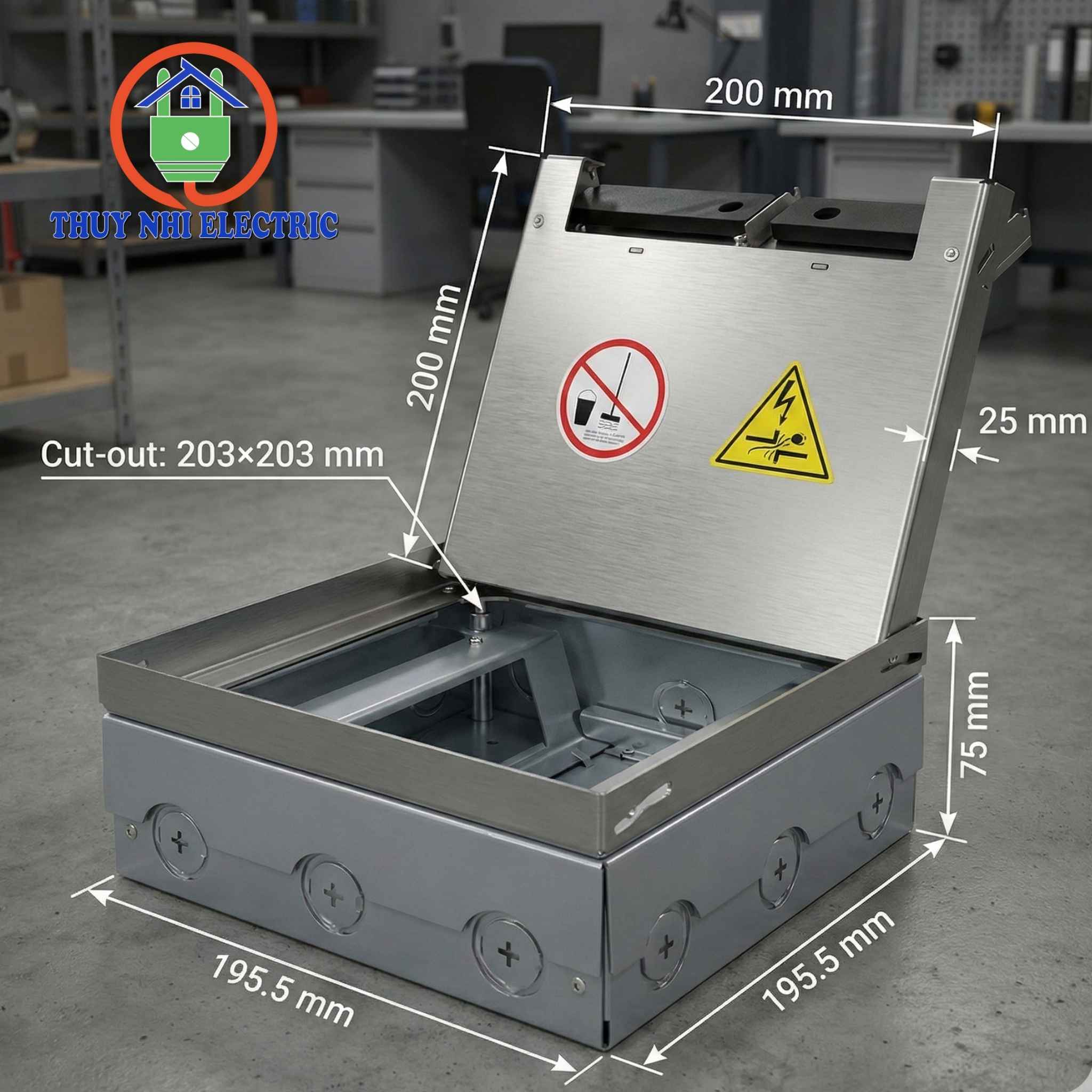 Đế thép sơn tĩnh điện an toàn: Phần đế âm kích thước 200x200mm được làm từ thép dày sơn tĩnh điện, bảo vệ an toàn cho thiết bị điện bên trong khỏi tác động của bê tông và độ ẩm sàn nhà.