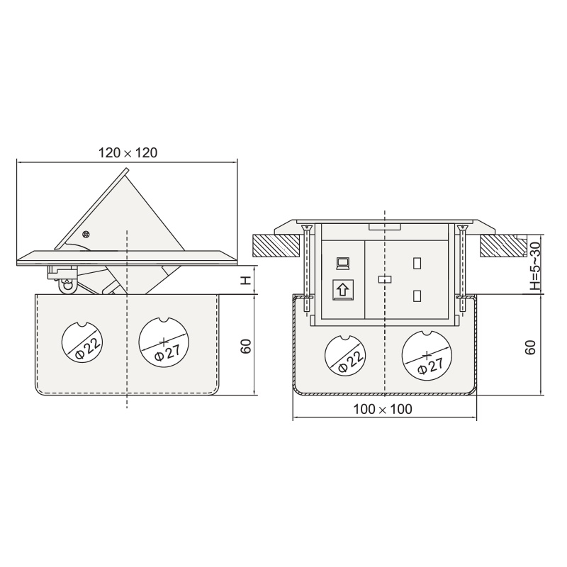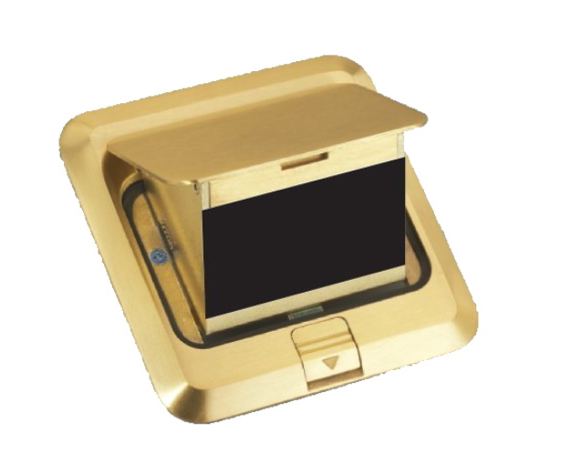 Ổ cắm âm sàn MPE màu vàng FL-60 với kiểu dáng hình vuông thiết kế siêu mỏng, tạo độ thẩm mỹ khi lắp đặt trong không gian.