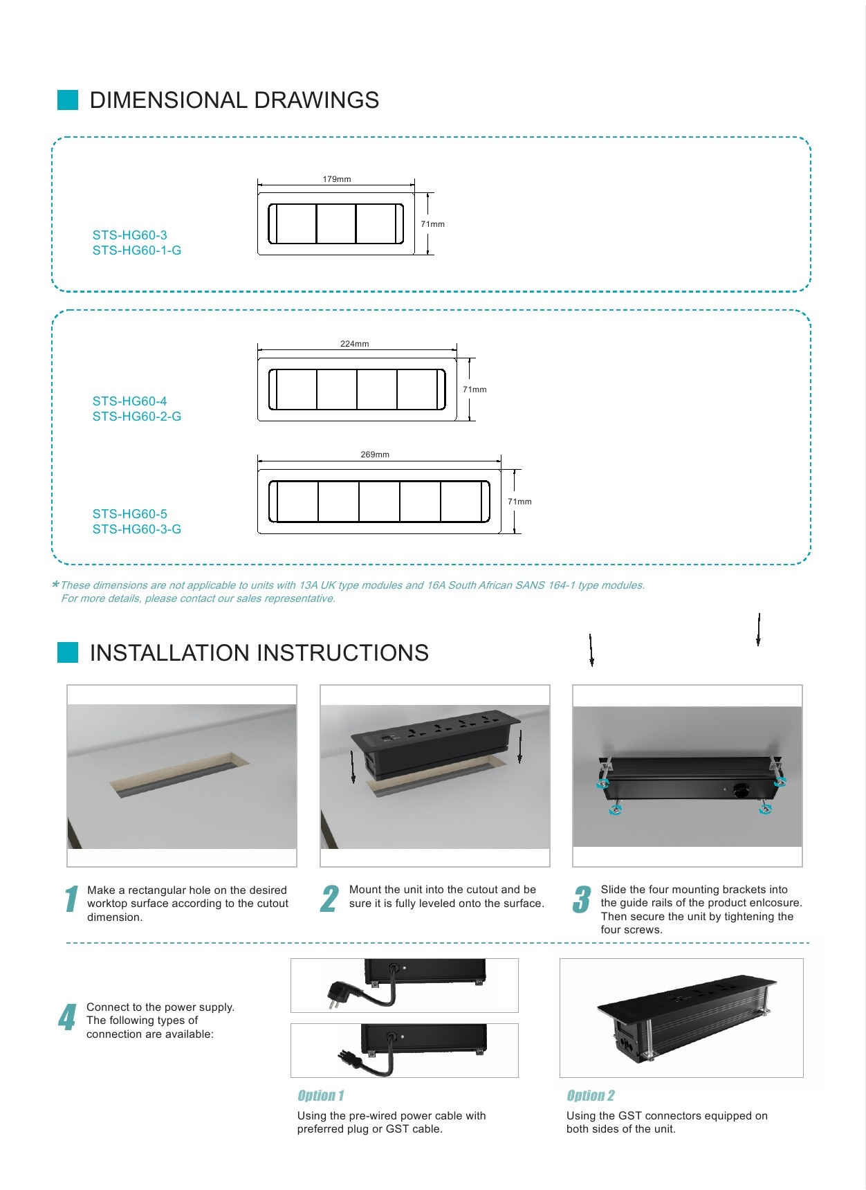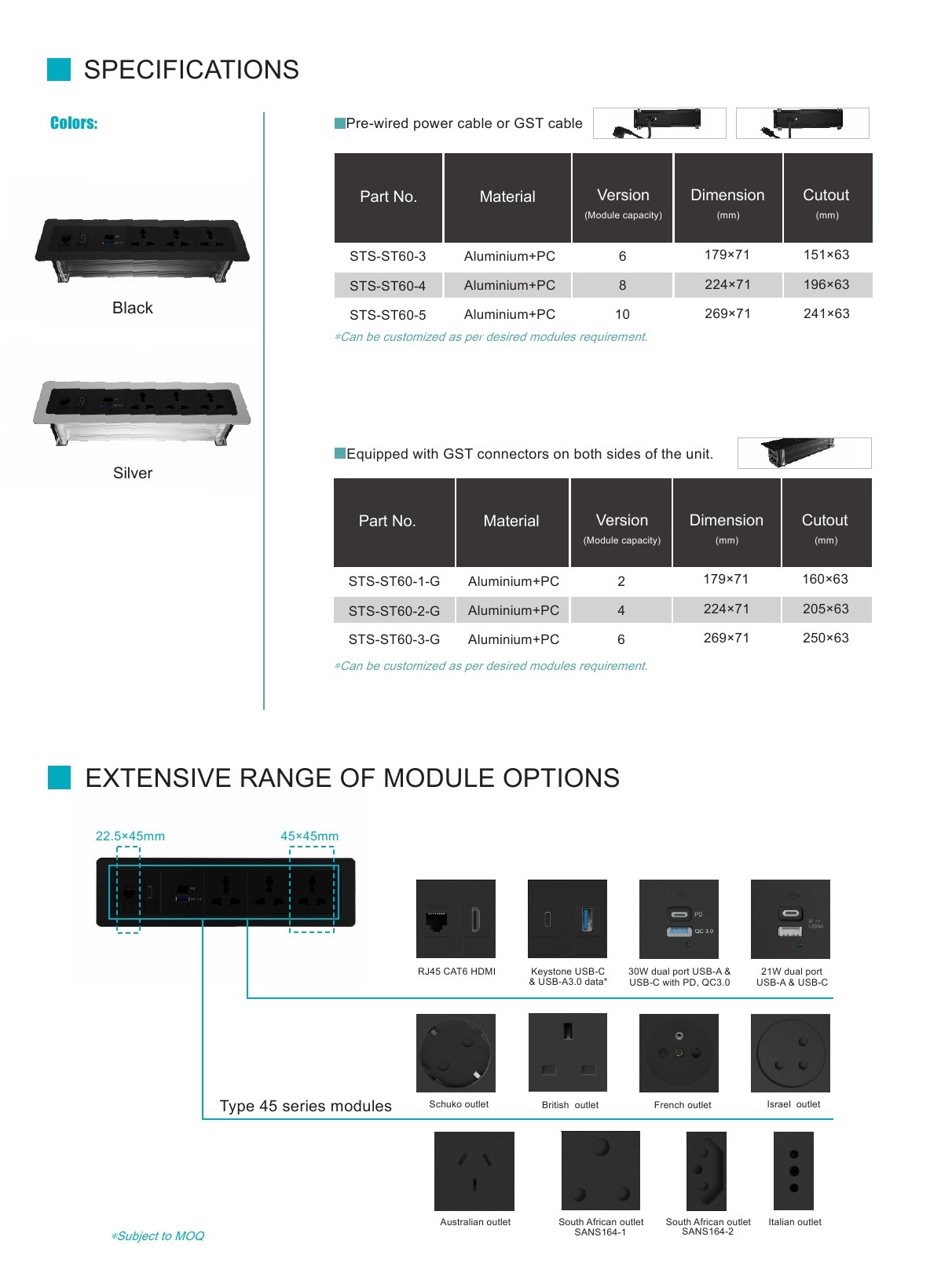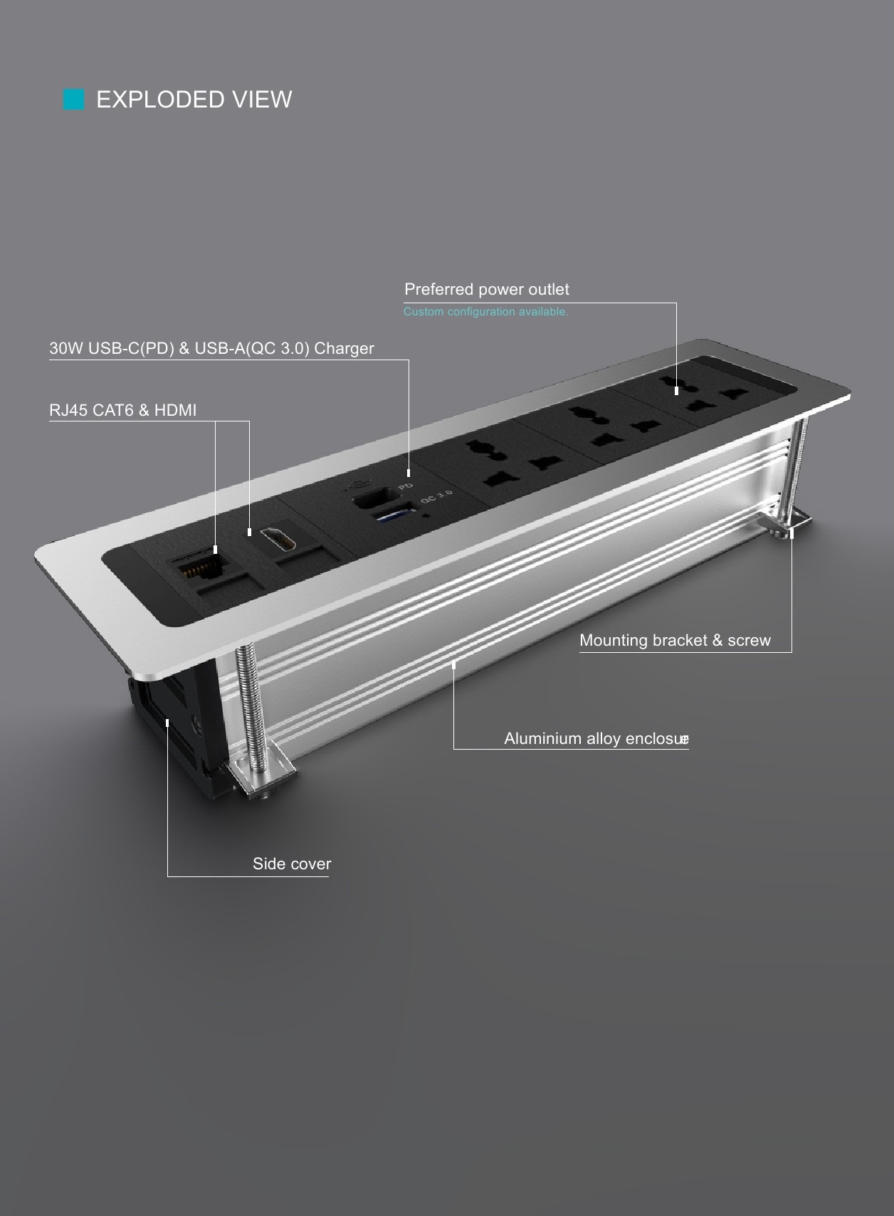 | Modun tích họp | 3 ổ cắm điện đa năng, HDMI, LAN Cat6, USB-A, USB-C |