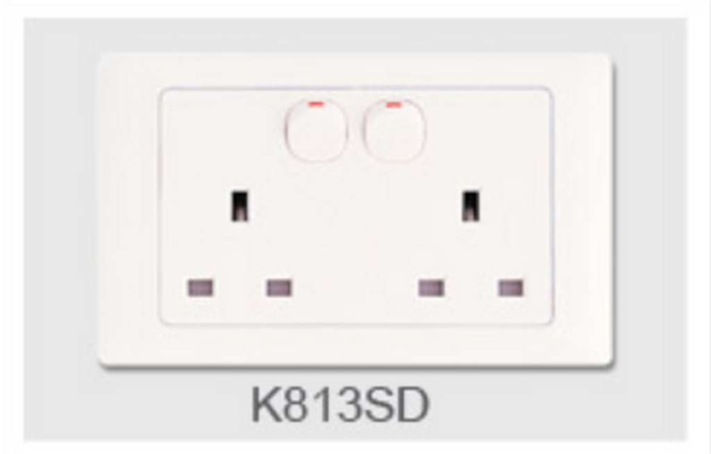 Ổ cắm đôi có công tắc chuẩn anh T&J K813SD là sản phẩm ổ cắm phù hợp với các thiết bị có phích lắm chuẩn anh, các thiết bị máy móc nhập khẩu. Gim trực tiếp dây thiết bị vào ổ mà không cần sử dụng phích chuyển đổi bất tiện.