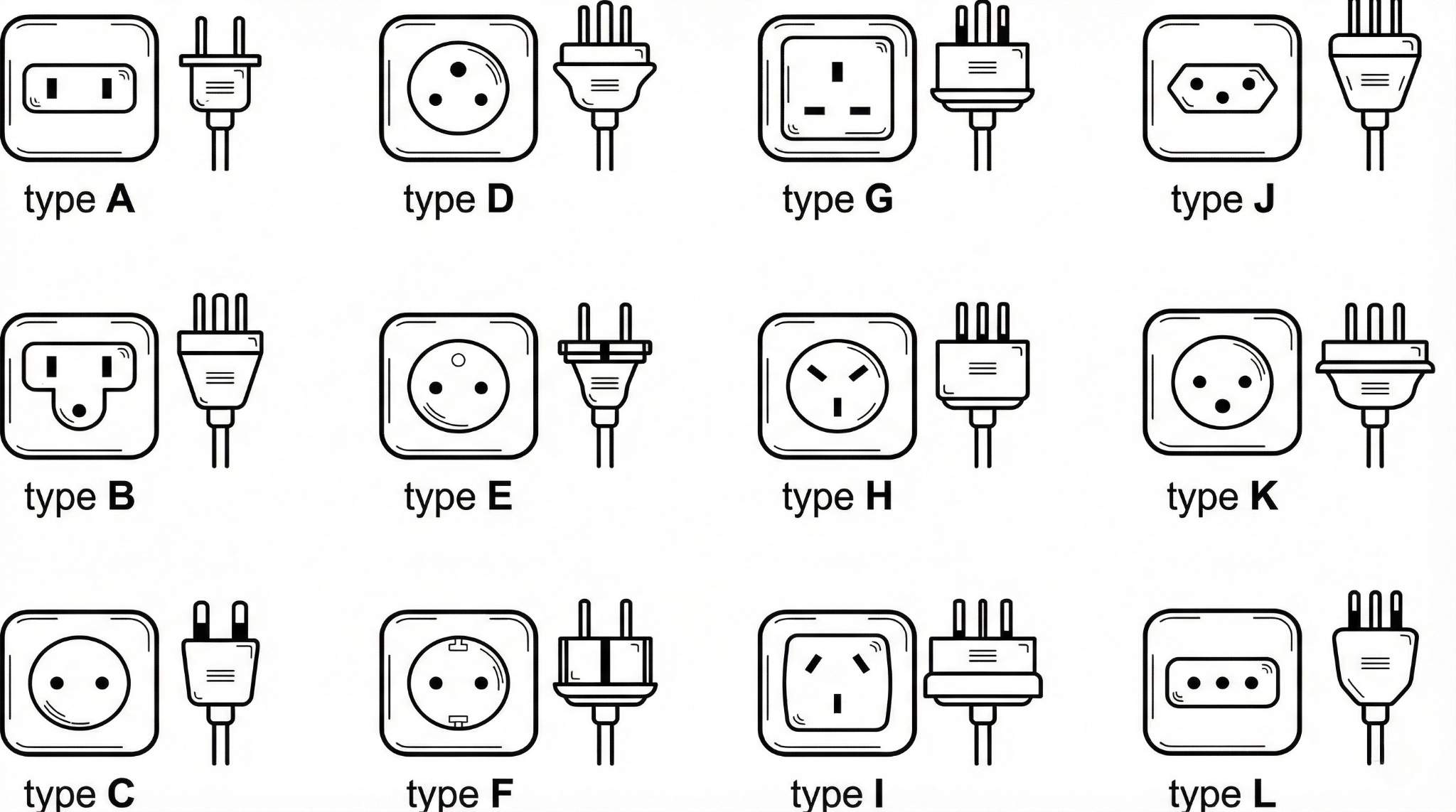 Hiện nay có 15 loại phích cắm & ổ điện chuẩn quốc tế được định danh từ Type A đến Type O, mỗi loại được sử dụng tại các khu vực địa lý khác nhau: