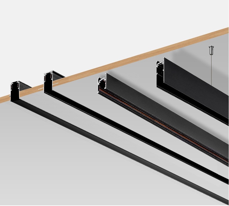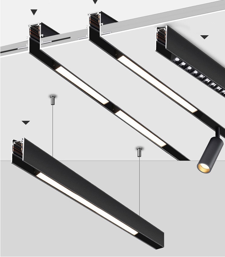 Thanh ray nam châm treo trần có thiết kế tương tự như loại lắp nổi, để có công năng treo trần, đơn giản người dùng chỉ việc sử dụng thêm phụ kiện cáp treo đèn thả mà chúng tối đang cung cấp để biến hóa công năng sản phẩm thành đèn treo trần.